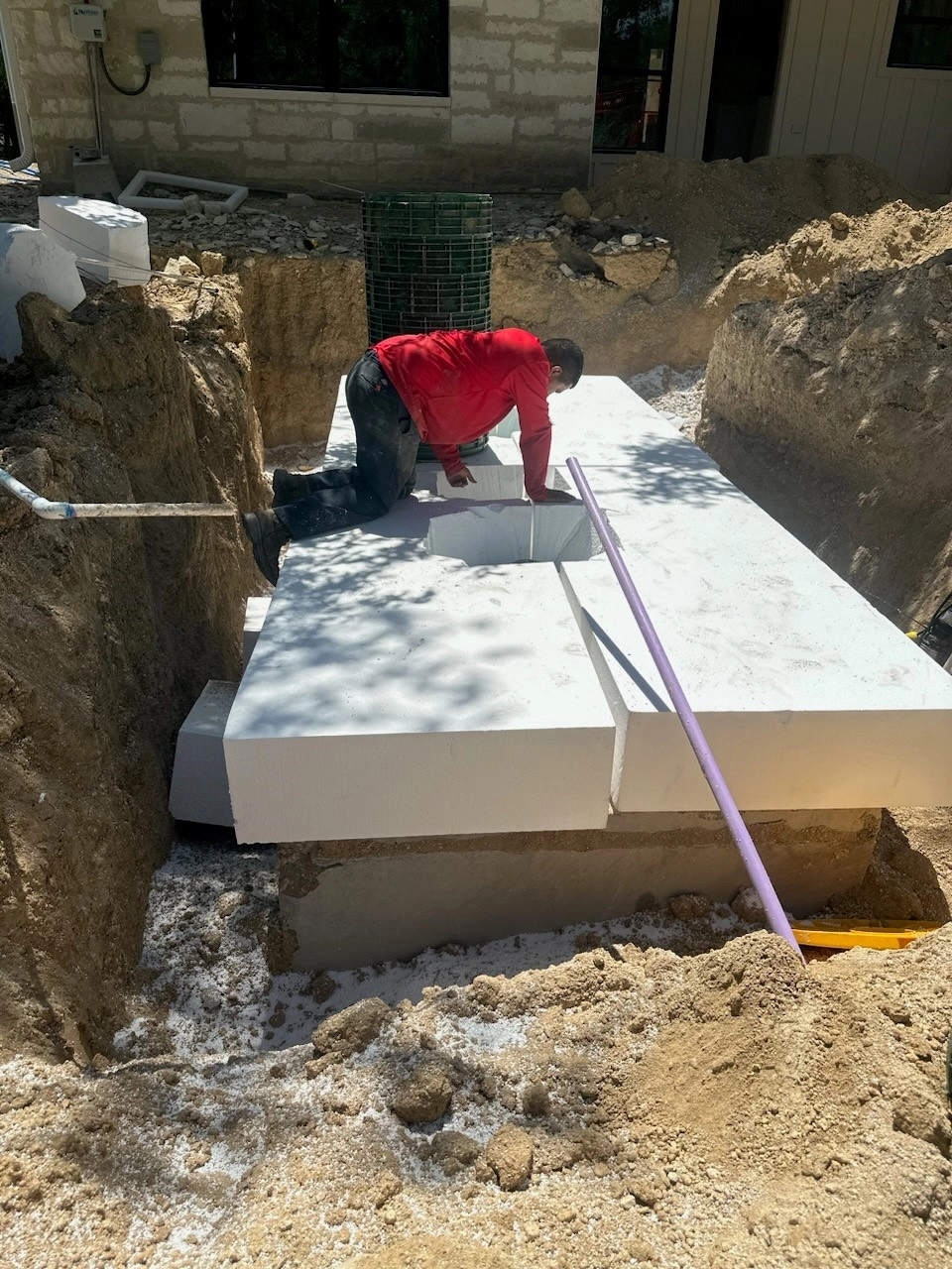 EPS Geofoam has many great physical properties that include its light weight and high compressive strength. This customer located in Temple, TX used 12" sheets of foam that were then cut with a Sawzall on site to lighten the load on top of a septic tank. Covering the septic tank solely with dirt would have exceeded the weight limit allowed.