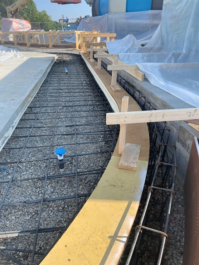 One of the more unique applications for EPS (expanded polystyrene) is the production of meandering drain forms for the type of drains found in splash parks. There are off the shelf metal forms for circles and ovals but the larger meandering drains require customer forms. At Universal Foam Products we have been providing these forms all over the country for the past several years, shipping from locations also in various parts of the country. The forms, which typically taper from top to bottom and also vary in depth to provide drainage, are produced on a CNC wire cutter or router. A single drain system can consist of many dozens of unique pieces so each piece is labeled and a drawing is provided showing where they are to be placed. The top part of each form is plywood which overhangs the EPS form on both sides creating the ledge where the drain grate will rest and also providing a durable surface where the drain forms can be secured from overhead prior to installing the concrete.